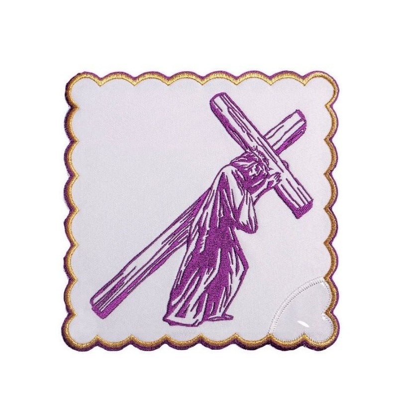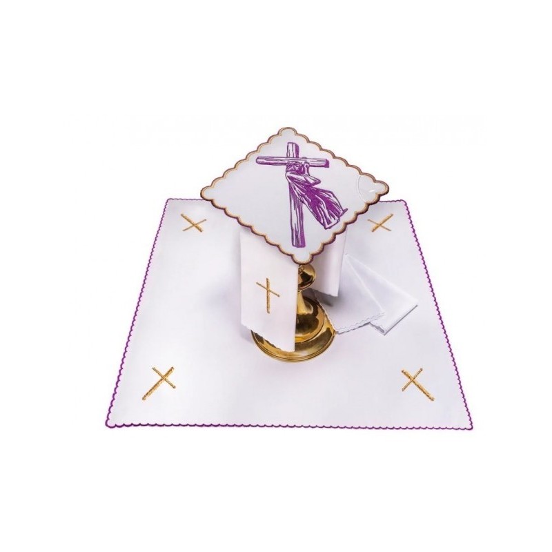 - Calice. Décorée d'une croix brodée et ornée de pierres. Garnie d'une délicate dentelle dorée, 100 % lin.